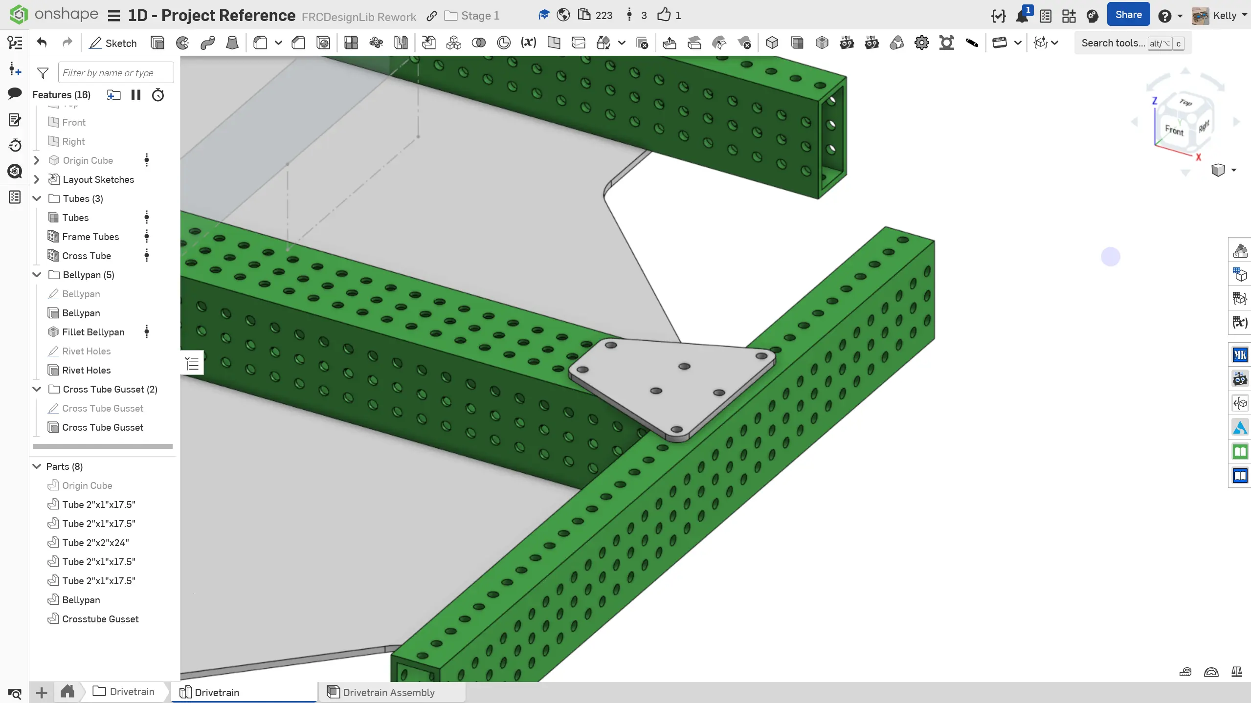 Start by navigating to the Drivetrain Part Studio in the Drivetrain folder. Follow the instructions in the slides to add the gusset.