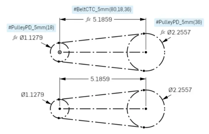 #BeltCTC_5mm()function to get an exact c-c distance for the 80T belt. Checking theShow Expressionsbox enables you to see the belt pitch, pulley tooth counts, and belt tooth count.#BeltCTC_5mm(n1, n2, n3): Calculates the c-c distance of an1tooth 5 mm pitch belt connecting pulleys with tooth countn2and pulley with tooth countn3.- Ex: