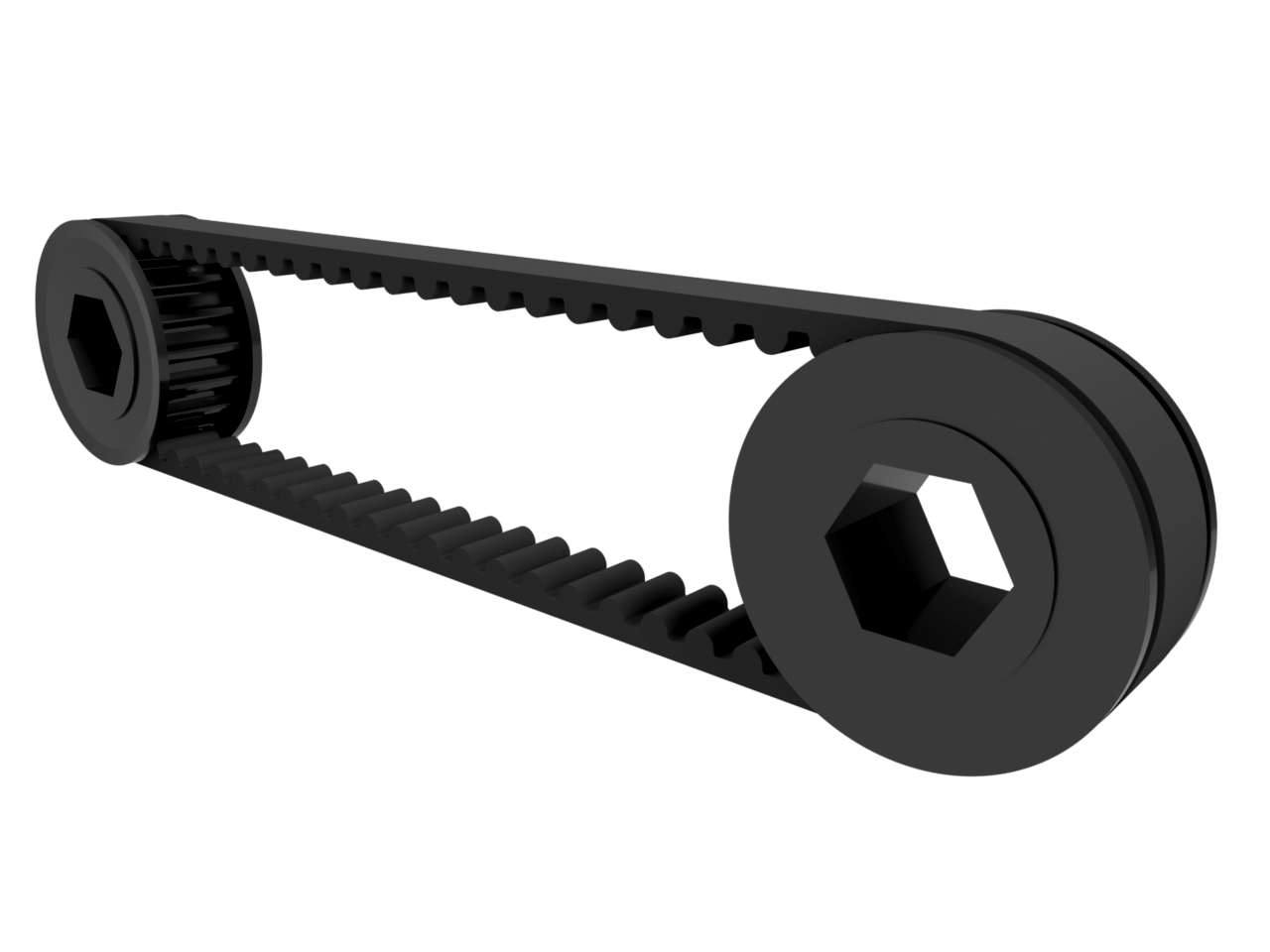 In order to change the torque and speed from the input to the output, different sized pulleys must be used. The mechanical advantage for belt transmissions, similar to gears, is based on the ratio between the number of teeth of the output pulley to the number of teeth of the input pulley. Note that unlike gears, pulleys will spin in the same direction.