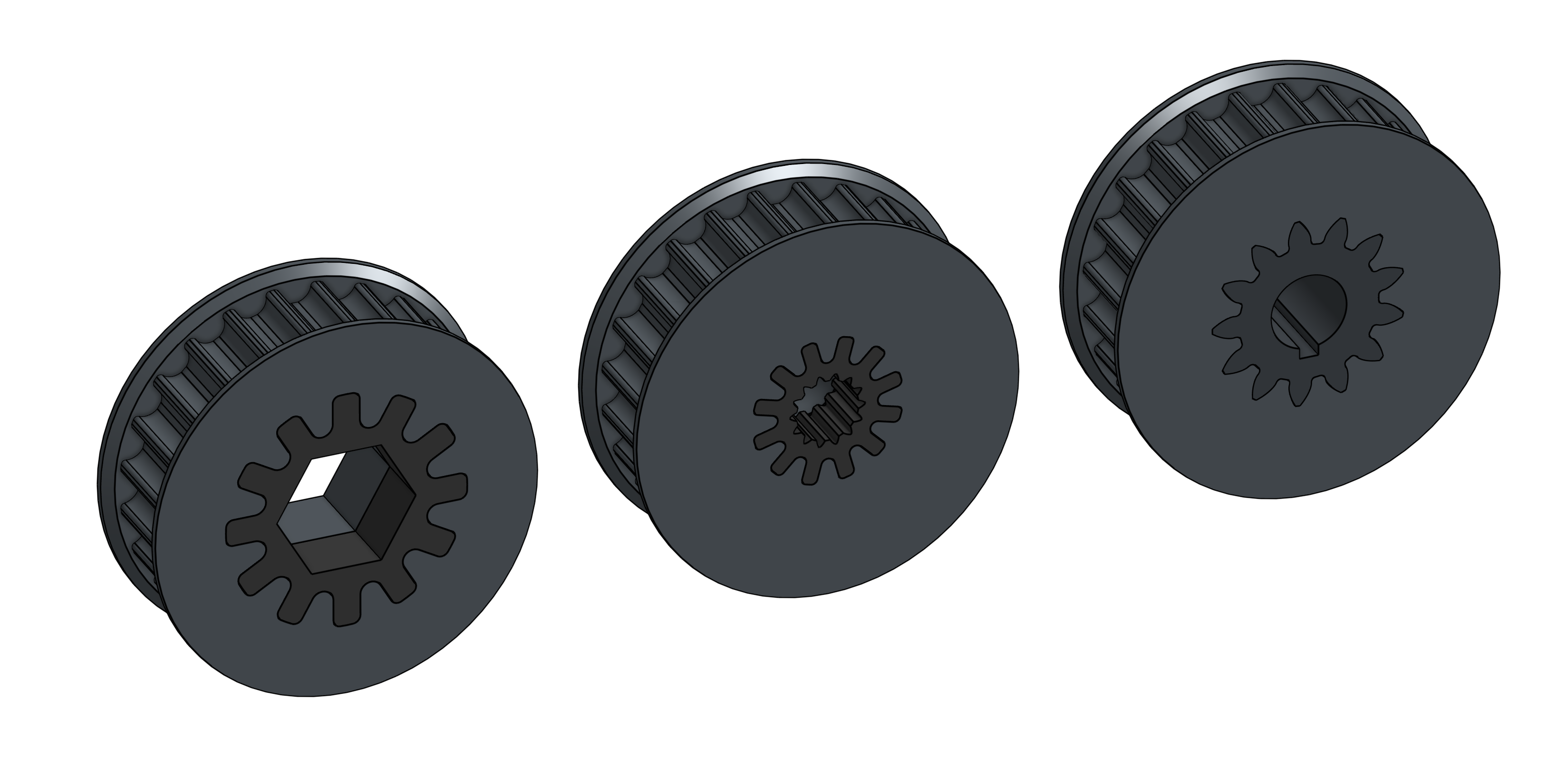 3D-printed pulleys with hex insert for hex shaft (left), SplineXS insert for Kraken motors (center), and pinion gear insert for NEO/CIM motors (right).