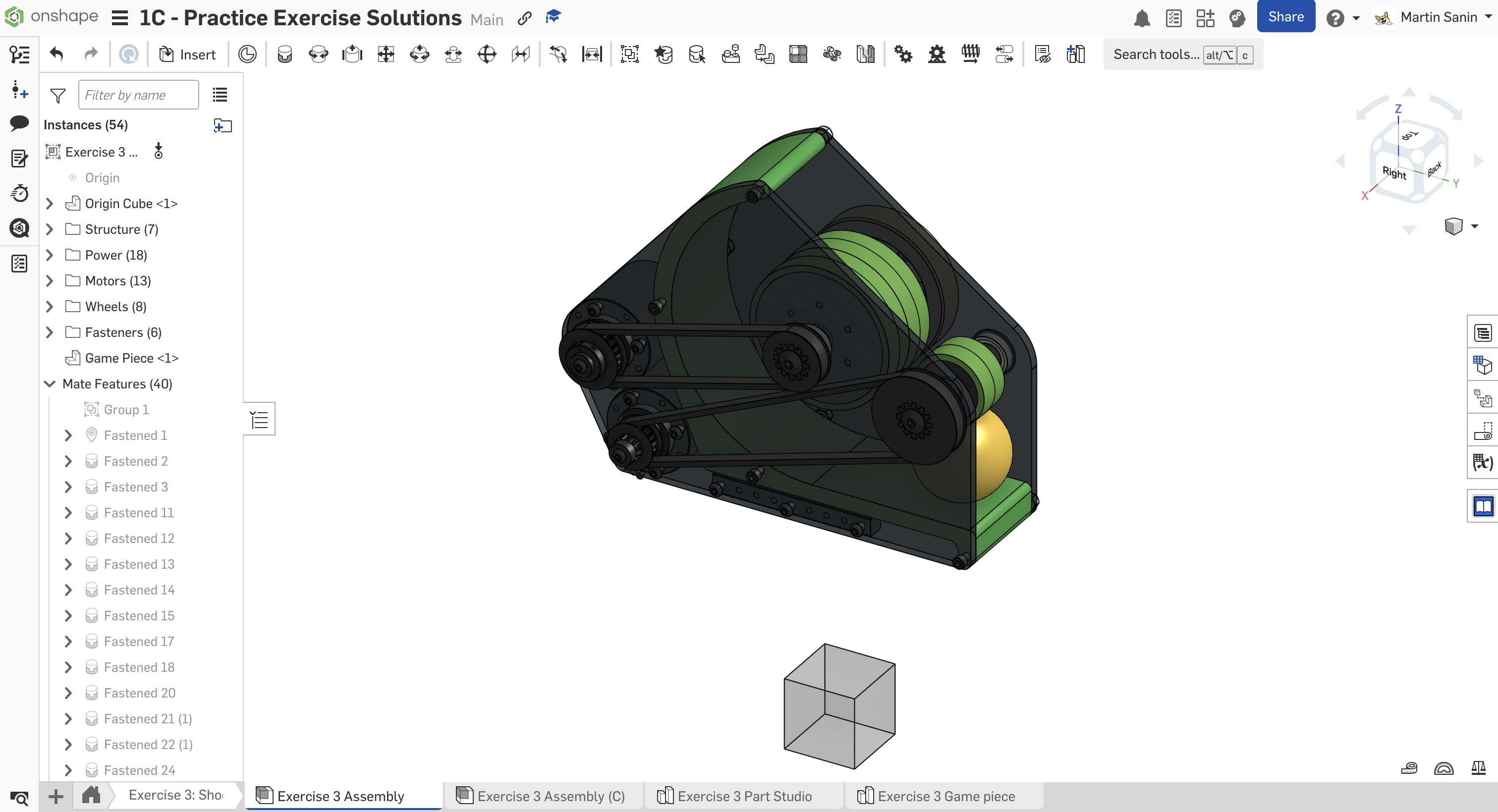 1. Insert all the part studio components. Group all the components except for the shafts and belts. Fasten the Origin Cube to the origin.
