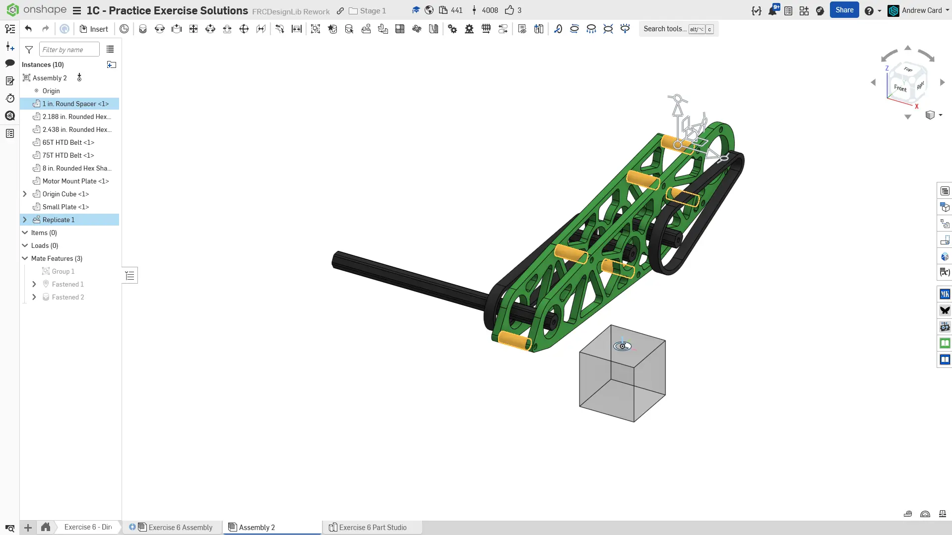 So far, you've used both custom spacers generated with the Spacer Featurescript as well as COTS 3/8" OD spacers from FRCDesignLib (the WCP Aluminum Spacers). There are pros and cons to using COTS or custom spacers that you should discuss with your team.