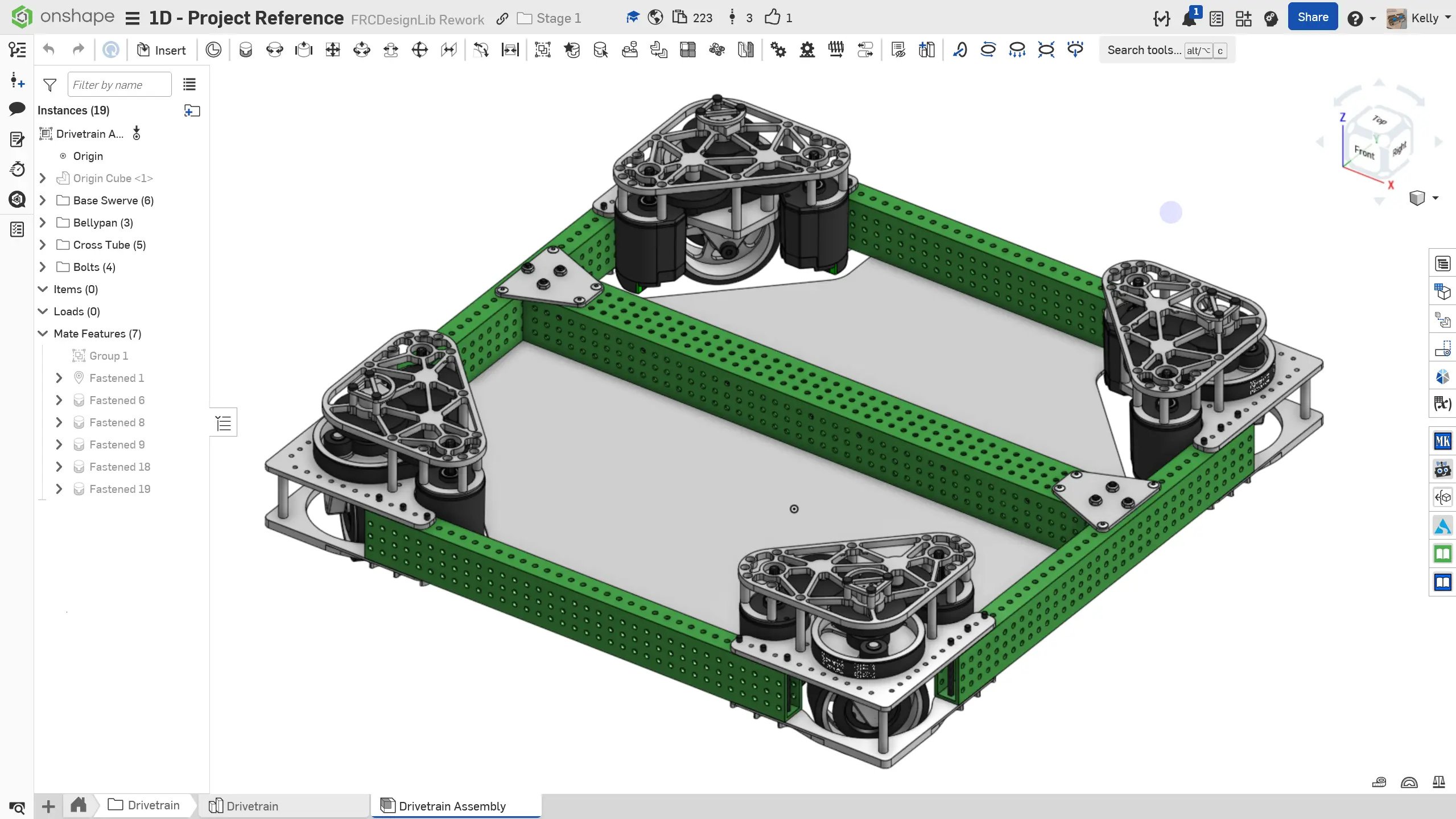 Make sure you sort the instances in your assembly into folders (i.e. frame, swerve modules) and name any patterns and replicates used. This will help you locate components in the assembly later down the line.