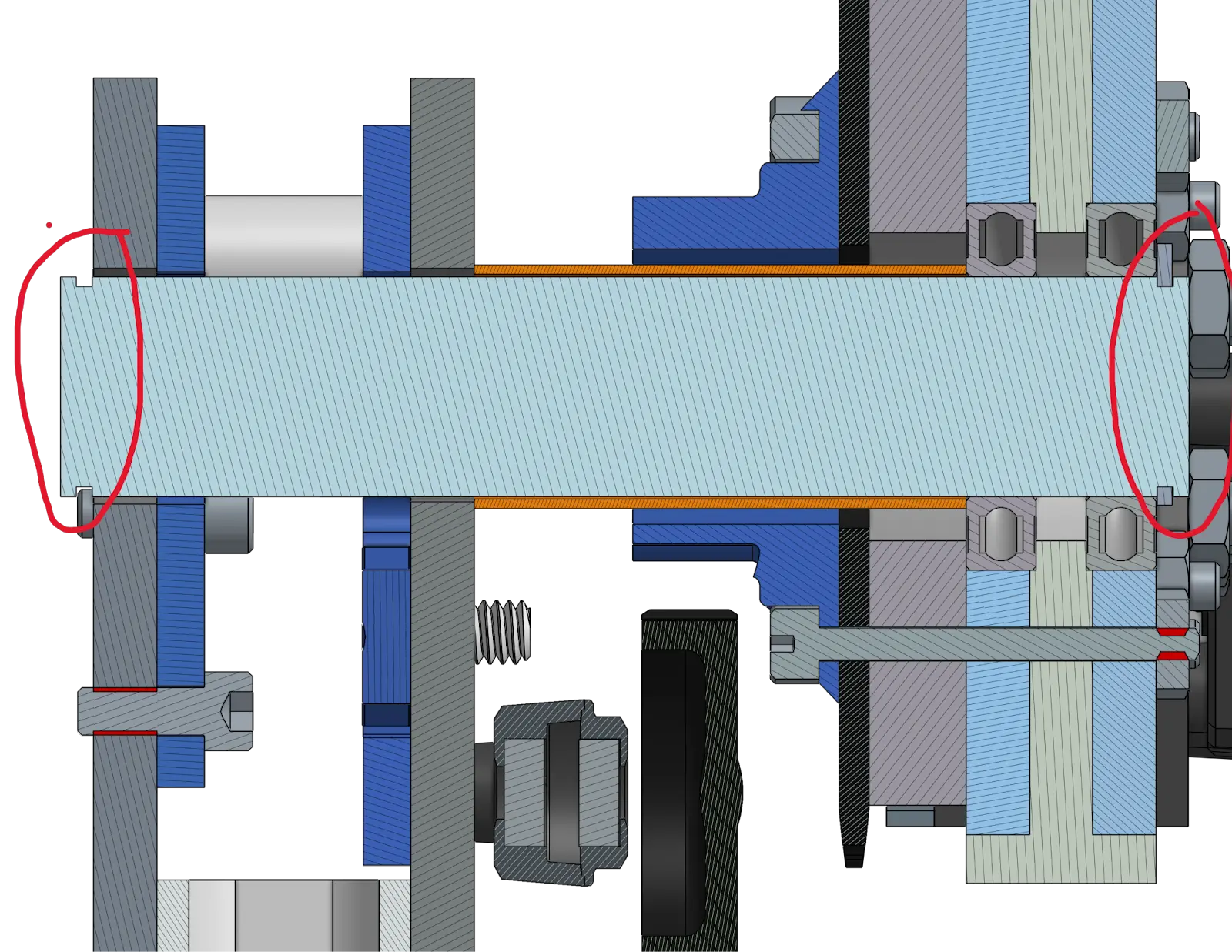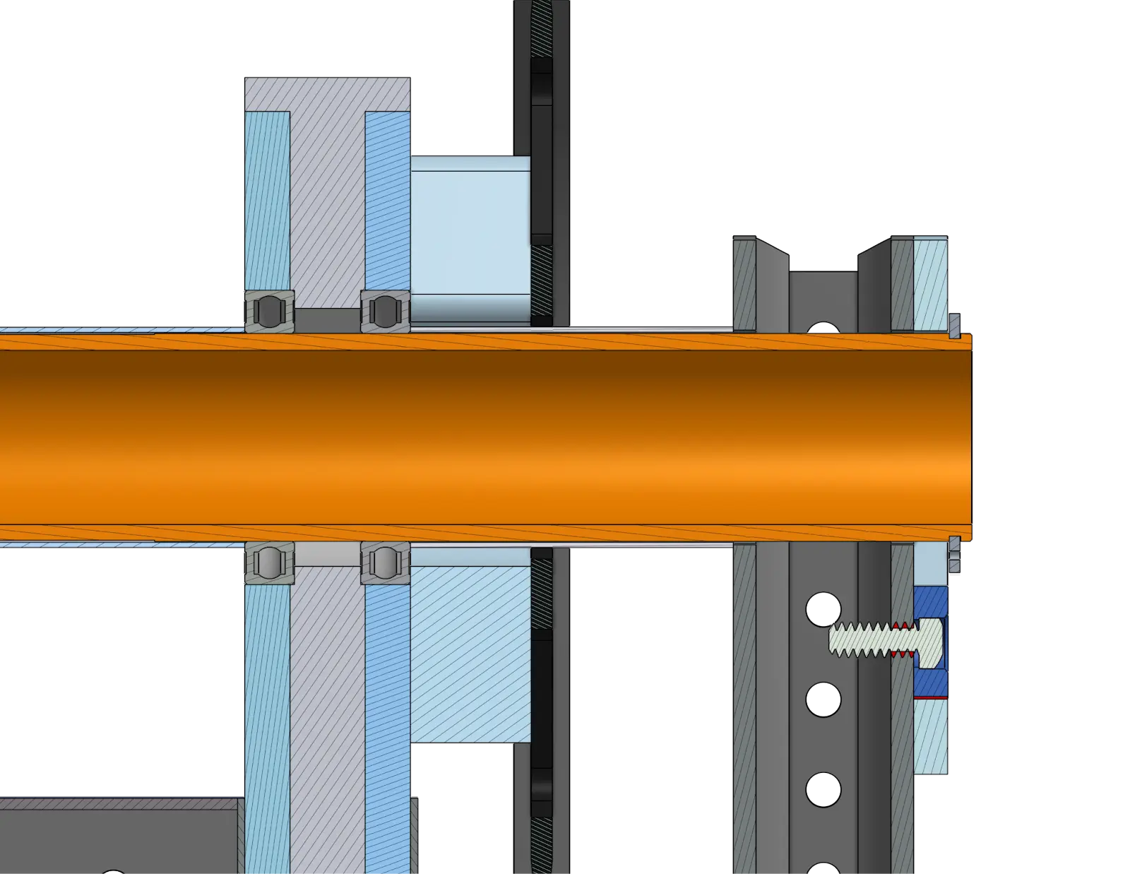 The dead axle tube (orange) has thin wall aluminum tube (1.25 OD 0.028 wall) acting as spacers, contacting the inner race of the bearing and the outer tube. The dead axle (orange tube) has a length of it turned 0.005” less than the 30mm OD of the rest of the tube (the length where no bearings are in contact) for assembly reasons.